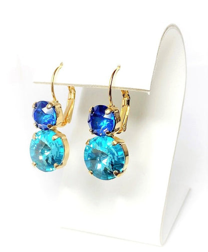Gorgeous earrings have a mix of Sapphire and Aquamarine crystals in 12mm and 8mm. They are set into gold plated nickel and lead free, lever back earring settings, with silver plated or rose gold plated as an option. A beautiful pair of everyday earrings.