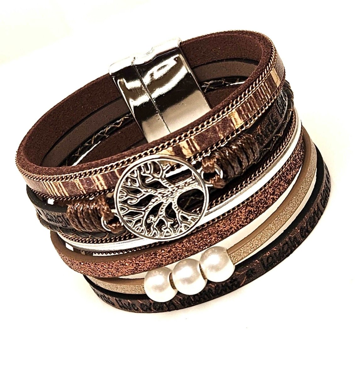 A lovely bohemian style bracelet featuring 5 strands and a multitude of materials including faux leather, crystals, and metal parts, including a tree of life charm. The clasp is magentic and very easy to clasp together. It measures 7.5 inches.